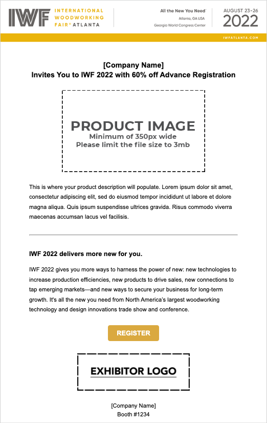 Four email templates have been created to promote your booth. Preview the templates below, then scroll down further to add your custom content, and select to download the emails to send on your own, or upload a qualified list and have Nvytes send the emails on your behalf!