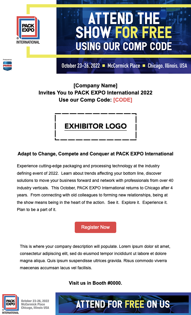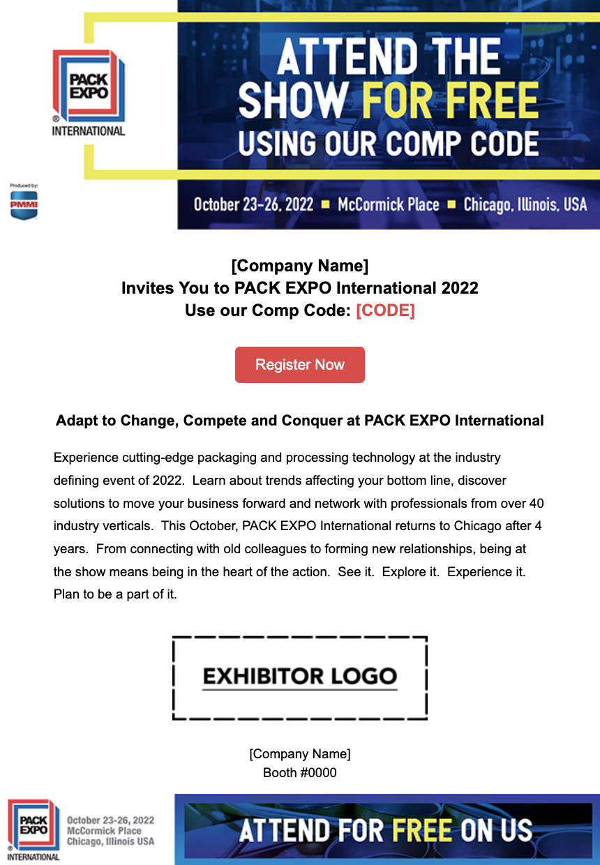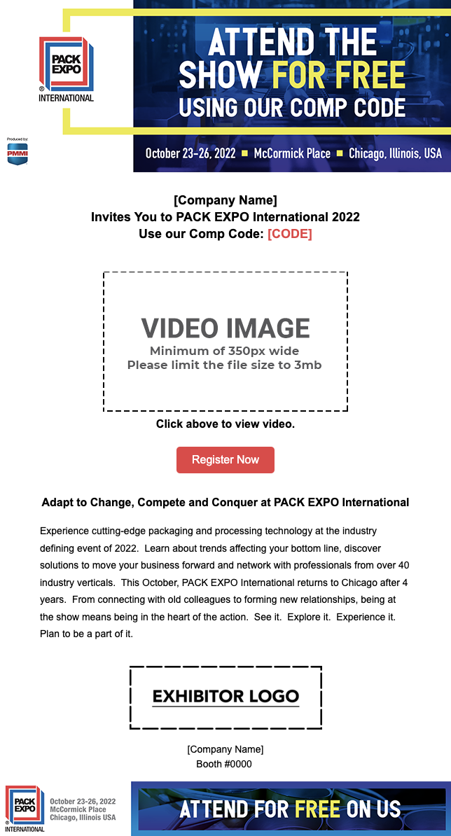 In order to have Nvytes send the emails on your behalf your email and contact list must be submitted 5 business days prior to the date you wish the email to deploy. Once your list is fully processed, your Account Manager will reach out to you with the approval status of your list, the Email Invitation proofs, and ask for email deployment dates. If there are no edits to the Email Invitation, respond to the email with your desired send dates. Be sure to add PackExpo@Nvytes.com to your contacts so the email isn't missed!
