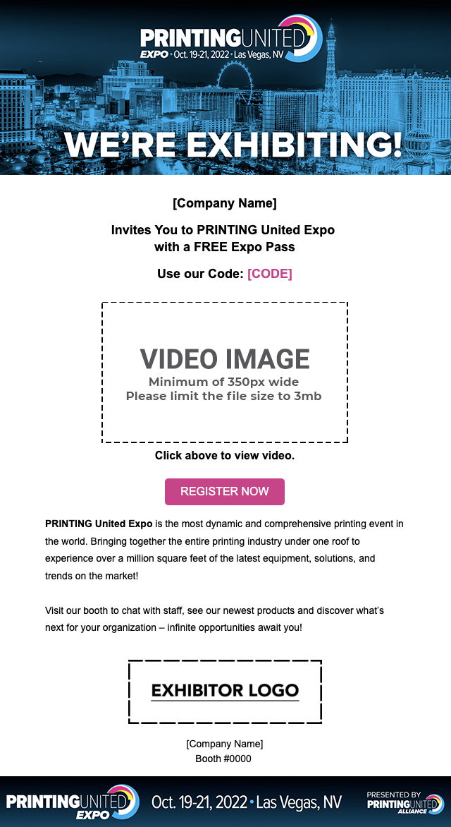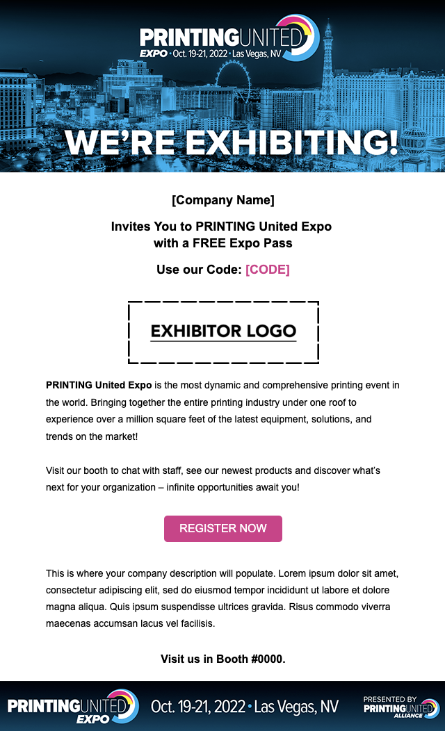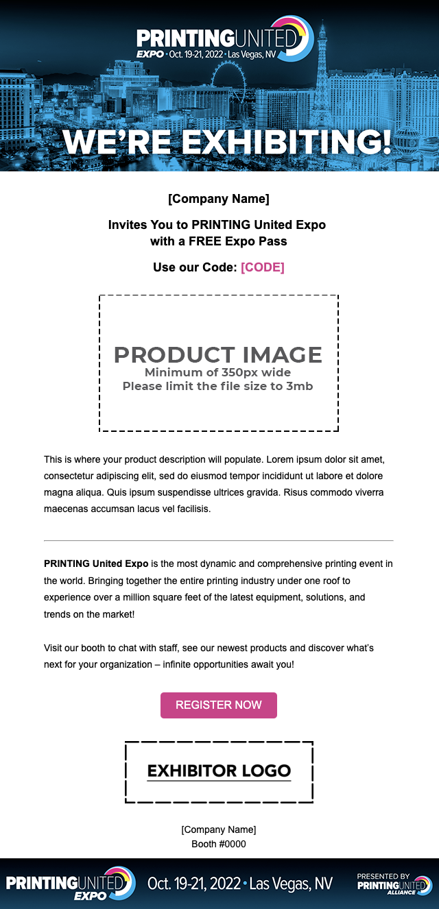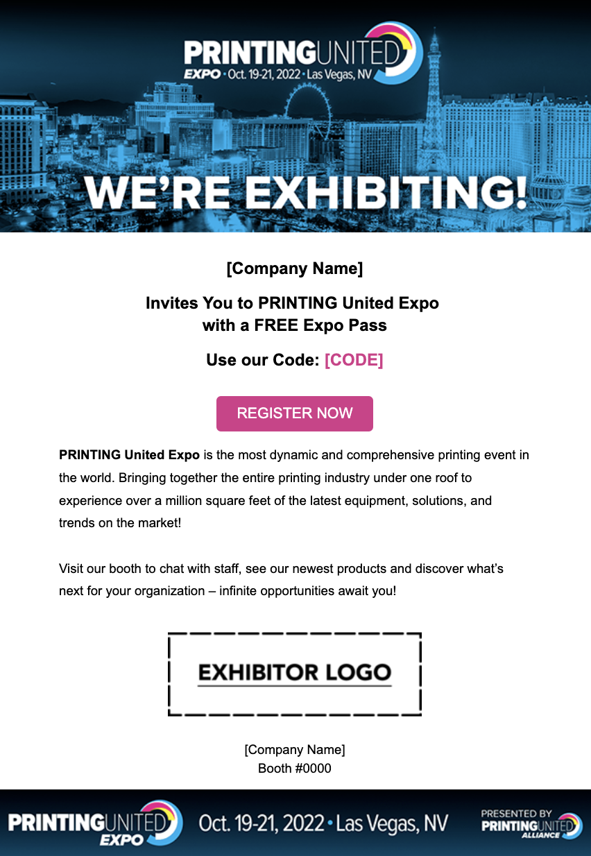 Four email templates have been created to promote your booth. Preview the templates below, then scroll down further to add your custom content, and select to download the emails to send on your own, or upload a qualified list and have Nvytes send the emails on your behalf!